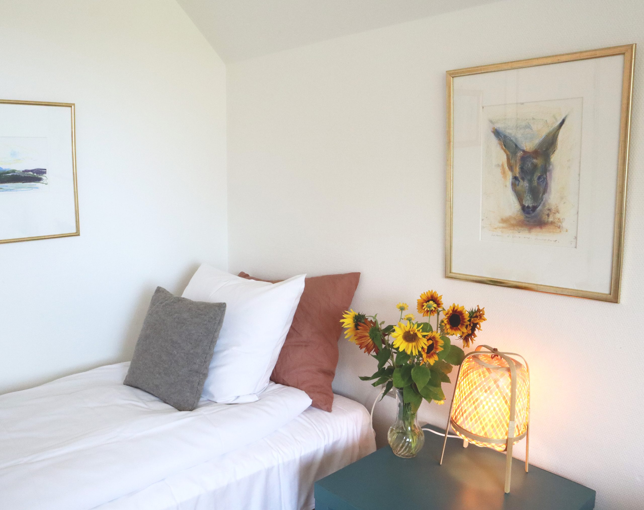 This first-floor gable room has a large west-facing window and faces onto the school gym. It also offers an excellent view of one of the alpaca fields, often used by the animals in winter. The paintings on the walls are the work of artist Estrid Thorbjørn Christensen (Helga Isager’s paternal aunt). Immediately outside the room are a toilet and bathroom, which are shared with room 38.